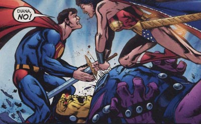 Pretty big difference – in the original issue, it seemed clear that Wonder Woman was indeed going to kill him. The image to the right shows Wonder Woman’s sword about to land on Mongul’s head edge first; that’s not a pinning strike. In the collected edition, however, she’s intent on capturing him.