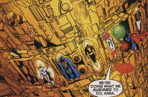 Page 240 – Panel 7 (Issue 7 – Page 28): This panel was originally silent; in the collection, Kal-L has a few more dying words for Power Girl. In the original Panel 6, Kal-L says: