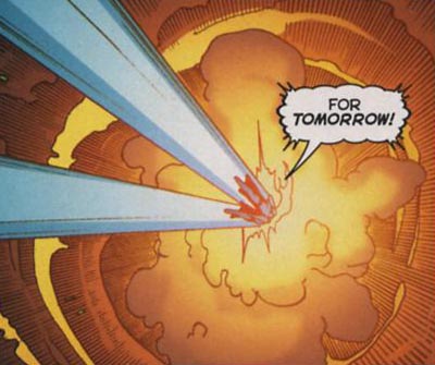 Page 229 – Panel 8 (Issue 7 – Page 18): A new item of dialogue is added as one to the two Supermen cries “For tomorrow!” as they fly off to tackle Superboy Prime.