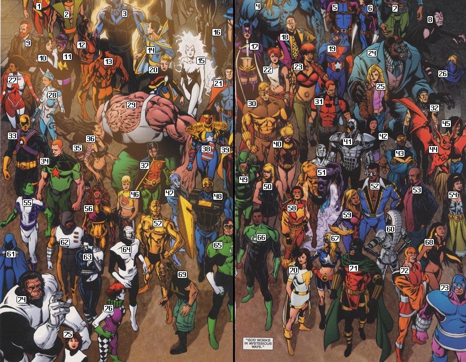 Pages 246 and 247 (Issue 7 – Pages 34 and 35): The two page spread of the heroes has been redrawn by George Perez with more characters. Here’s the numbered version (click to see a larger version) with the key below: