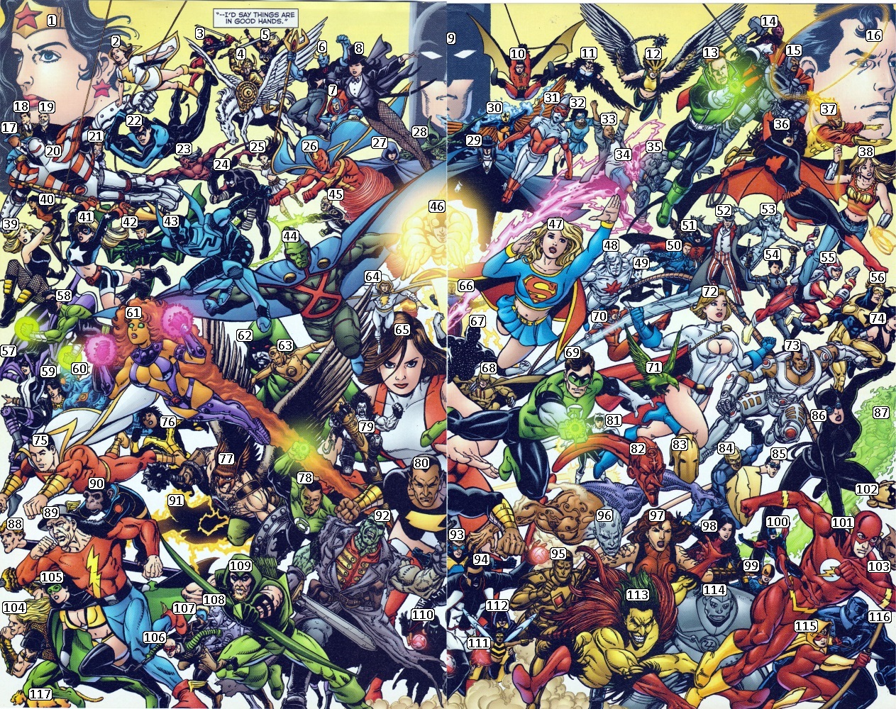 1) Wonder Woman 2) Mary Marvel 3) Katana 4) Shining Knight 5) Lady Blackhawk 6) Blue Devil 7) Nightmaster 8) Zatanna 9) Batman 10) Robin 11) Black Condor 12) Hawkgirl 13) Green Lantern Guy Gardner 14) Steel [Natasha Irons] 15) Steel [John Henry Irons] 16) Superman 17) The Question 18) Will Magnus 19) The Chief 20) STRIPE 21) Etta Candy 22) Nightwing 23) Red Devil 24) Wildcat 25) Isis 26) Red Tornado 27) Raven 28) Ragman 29) Phantom Stranger 30) Firehawk 31) Bulleteer 32) Nightshade 33) Jakeem Thunder 34) Thunderbolt 35) Monolith 36) Batwoman 37) Firestorm 38) Wonder Girl 39) Black Canary 40) Vixen 41) Star-Spangled Kid 42) Enchantress 43) Blue Beetle 44) Martian Manhunter 45) Green Lantern Alan Scott [in his role as Checkmate’s White King] 46) The Ray 47) Supergirl 48) Captain Atom 49) Klarion 50) Captain Boomerang 51) Dr Mid-Nite 52) Uncle Sam 53) Platinum 54) Sasha Bordeaux [as Checkmate’s Black Queen] 55) Adam Strange 56) Booster Gold 57) Huntress 58) Ion 59) Gypsy 60) OMAC 61) Starfire 62) The Spectre 63) Gold 64) Shazam 65) Elasti-Girl 66) Black Lightning 67) Starman 68) Catman 69) Green Lantern Hal Jordan 70) Manhunter 71) Changeling 72) Power Girl 73) Cyborg 74) Donna Troy 75) Captain Marvel 76) Thunder 77) Hawkman 78) Green Lantern John Stewart 79) Lobo 80) Black Adam 81) Dr Light 82) Mercury 83) The Helmt of Fate 84) Manhattan Guardian 85) Plastic Man 86) Catwoman 87) Fire 88) Elongated Man 89) Flash [Jay Garrick] 90) Detective Chimp 91) Negative Man 92) Frankenstein 93) Animal Man 94) Mr Terrific 95) Robotman 96) Metamorpho 97) Grace 98) Lady Shiva as the Jade Canary 99) Ravager 100) Atom 101) Flash [Bart Allen] 102) Skeets 103) Copper 104) Aquaman 105) Phantom Lady 106) Doll Man 107) Sand 108) Tin 109) Green Arrow 110) Human Bomb 111) Bumblebee 112) Hourman 113) Creeper 114) Lead 115) Speedy 116) Iron 117) Either Power Girl’s cat or Teekl, Klarion’s familiar.