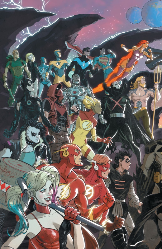 1) Batgirl 2) Nightwing 3) Summer Zahid 4) Red X 5) Hippolyta 6) Wonder Woman 7) Batwoman 8) Aquaman 9) Green Lantern Alan Scott 10) Duke Thomas 11) Green Lantern Sojourner Mullein 12) Catwoman 13) Flash (Wally West) 14) Roy Harper 15) Naomi 16) Superman (Jonathan Kent) 17) Steel 18) Crush 19) Black Canary 20) Superman (Clark Kent) 21) Starfire 22) Batman 23) Flash (Barry Allen) 24) Yara Flor 25) Black Adam 26) Stargirl 27) STRIPE 28) Batman (Timothy Fox) 29) Green Arrow 30) Red Hood 31) Beast Boy 32) Cyborg 33) Green Lantern John Stewart 34) Donna Troy 35) Supergirl 36) Spoiler 37) Hawkgirl 38) Raven 39) Captain Marvel 40) Damian Wayne 41) Nubia 42) Harley Quinn 43) Huntress