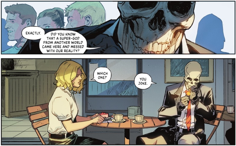 Page 14 – Panel 3: The “super-god from another world” that Bones mentions is either Perpetua or the Batman Who Laughs, both antagonists in DARK NIGHTS: DEATH METAL.