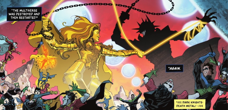 Page 16: Each panel shows the point of view of the Thomas Wayne Batman see at the start of the issue as he returns to consciousness. The people coming into view, from left to right, are Captain Carrot of Earth-26; Machinehead from Earth-8; Aquawoman from Earth-11; and Mary Marvel from Earth-5. Aquawoman mentions the “dark multiverse” which was where the Batman Who Laughs and other antagonists of DARK NIGHTS: DEATH METAL originated.