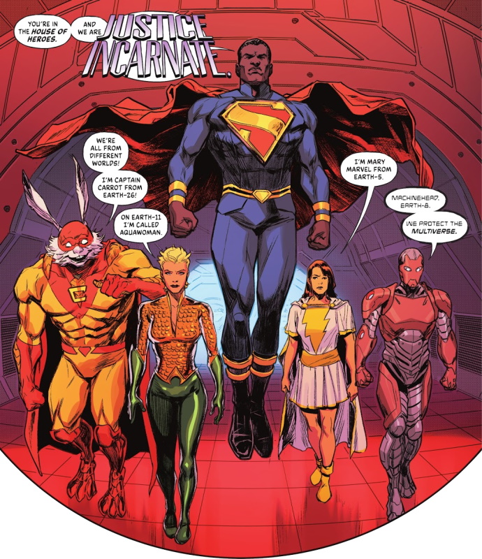 Page 18 – Panel 1: The newest member here is Superman of Earth-23 who was last mentioned back on page 3; everyone else has been noted above.
