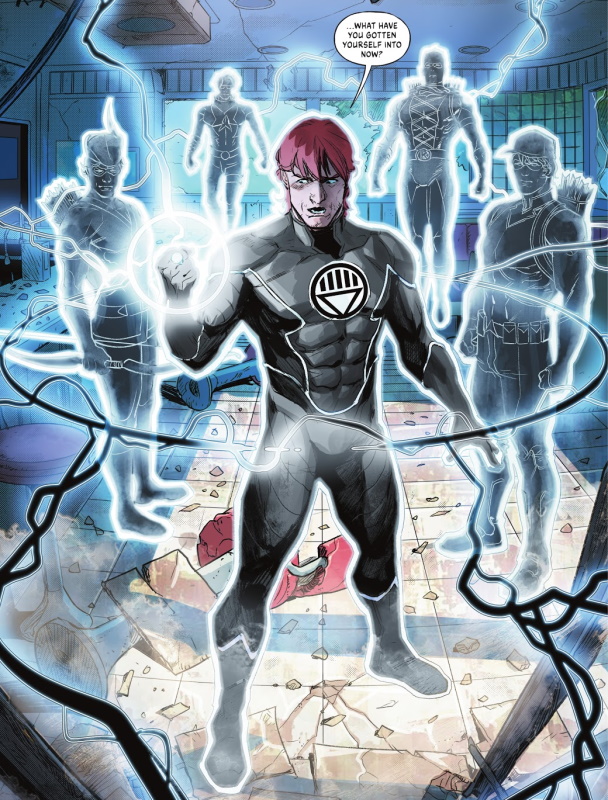 Page 32: . . . it was himself using a Black Lantern ring, something that can only be used by the dead. Surrounding him, left to right, are ring constructs of himself as Speedy, Arsenal, Red Arrow, and the post-FLASHPOINT version of Red Arrow.