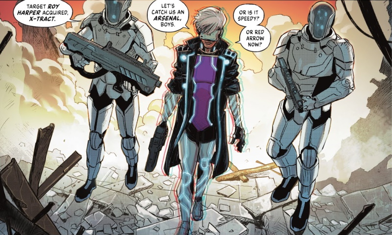 Page 28 – Panel 2: The character in the middle is X-Tract. Her mention of Arsenal, Speedy and Red Arrow are all names Roy has used in his superhero career.