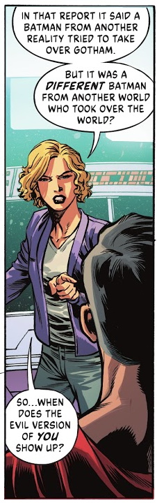 Page 5 – Panel 3: The Batman “from another reality” who tried to take control of Gotham was the Thomas Wayne from FLASHPOINT (whom we saw in the previous issue) or at least I think it was; if I’m wrong, use the Contact Me page at the top to let me know. The “different Batman from another world” is the Batman Who Laughs, the villain of DARK NIGHTS: DEATH METAL. Chase asks Superman when the evil version of him turns up, which means she missed FOREVER EVIL . . . lucky her.