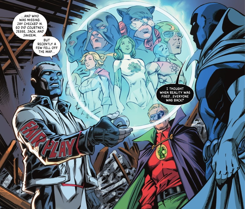 Page 13 – Panel 5: The Totality is the group of heroes and villains, including GL Scott, Savage, and Mr Terrific, who monitor for multiversal attacks.