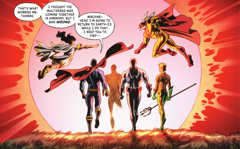 Page 12 – Panels 3 and 4: They come to the conclusion that not everyone in the Multiverse is happy with the new status quo. Superman tasks Machinehead with finding Barry Allen.