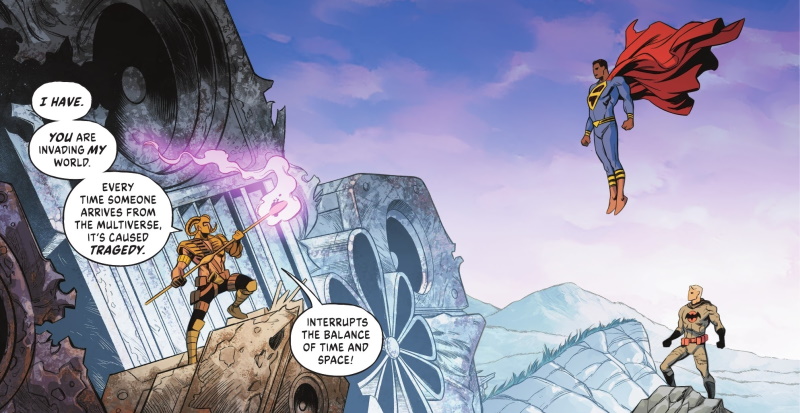 Page 9 – Panel 1: On the right is Thomas Wayne, the Batman of the Flashpoint timeline. He has accompanied Superman to reclaim the crashed spaceship that Magog stands upon. Magog makes a recurring point in this series – that travel between worlds causes problems.