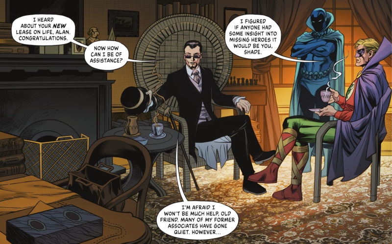 Page 4 – Panel 1: The Shade is a Golden Age villain who, during the STARMAN run in the 90s was reinvented as something of a gentleman thief and almost anti-hero rather than a straight up villain. GL Scott’s remark that he thought the Shade would have “some insight into missing heroes” doesn’t really make sense – if he thought the Shade knew something, why not go to him first?