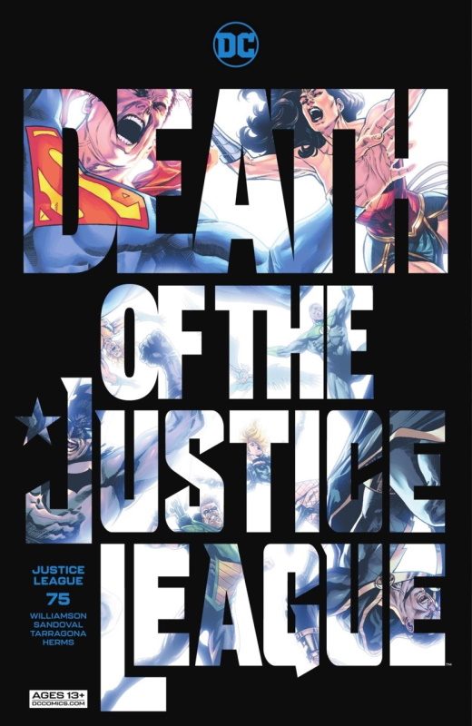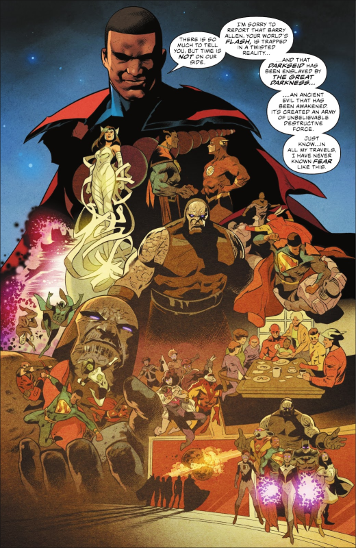 Across the top is Wonder Woman as seen in INFINITE FRONTIER #0 after she’d ascended at the end of DARK NIGHTS: METAL. Beside her is President Superman welcoming Barry Allen to Justice League Incarnate, while directly below them is Darkseid.