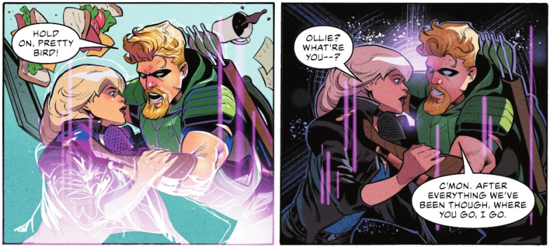 Page 3 – Panels 1 and 2: Arrow grabs on to Canary and they teleport together.