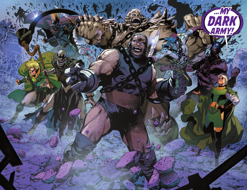 Page 27 – Panel 4: With Pariah’s control or access to the Great Darkness damaged, the Dark Army begin to falter.
