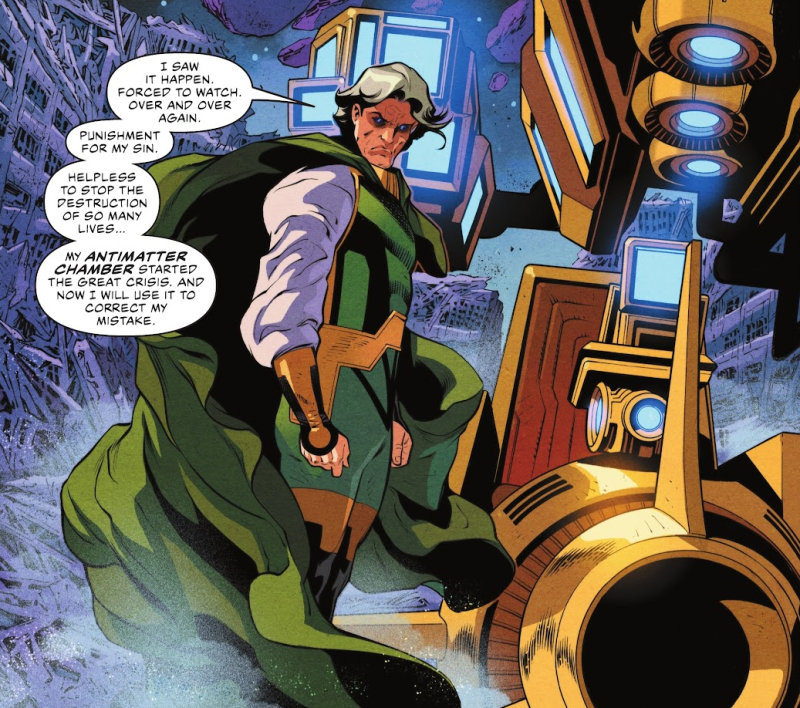 Pages 16 and 17 – Panel 5: Pariah’s origin, including his accidental destruction of his homeworld, was revealed in the classic CRISIS ON INFINITE EARTHS #7.