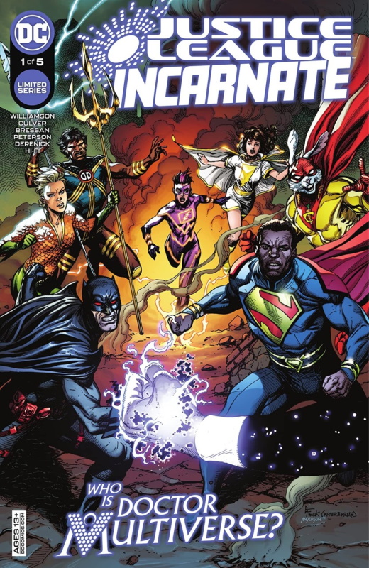 Cover: From the bottom left and the clockwise around the cover are Flashpoint Batman Thomas Wayne; Aquawoman of Earth-11; Thunderer of Earth-7; Flash (Avery Ho) of Earth-0; Mary Marvel of Earth-5; Captain Carrot of Earth-26; and Superman of Earth-23. The fist in the foreground belongs to Dr Multiverse of Earth-8.