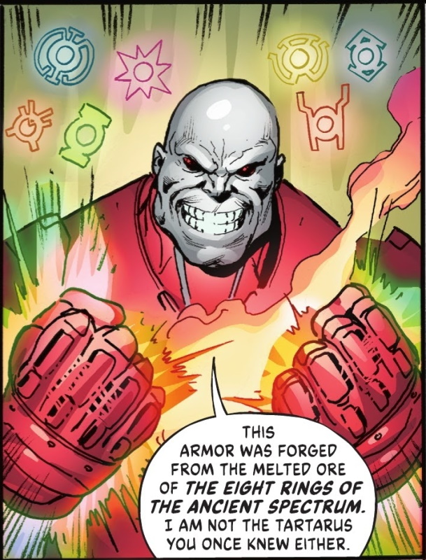 Page 20 – Panel 3: The symbols above his head are those of the emotional spectrum (at least on Earth-0) and left to right are on the top row: blue for hope, purple for love; yellow for fear; violet for empathy; on the bottom row are orange for avarice; green for will; and red for anger. Tartarus mentions “eight rings” despite there being seven symbols.
