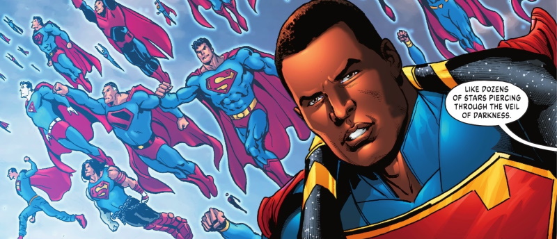 Page 22 – Panel 1: . . . multiple versions Superman. There are seven distinct Supermen to the left of the panel; top to bottom and left to right are the Supermen of Earth-30 (RED SON); Earth-6 (JUST IMAGINE); Earth-38 (GENERATIONS); Earth-22 (KINGDOM COME); Earth-0; an unknown Superman with long blue trousers; and the Superman of DARK NIGHTS METAL.