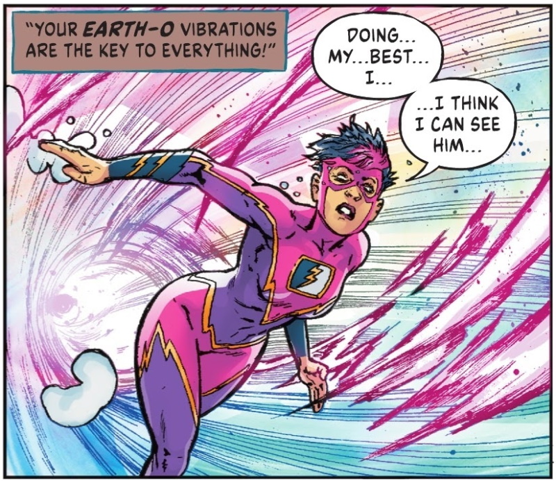 Page 12 – Panel 5: Avery’s vibrations allow Harbinger to home in on Barry and transport Batman, Superman, Captain Carrot, and Avery to . . .