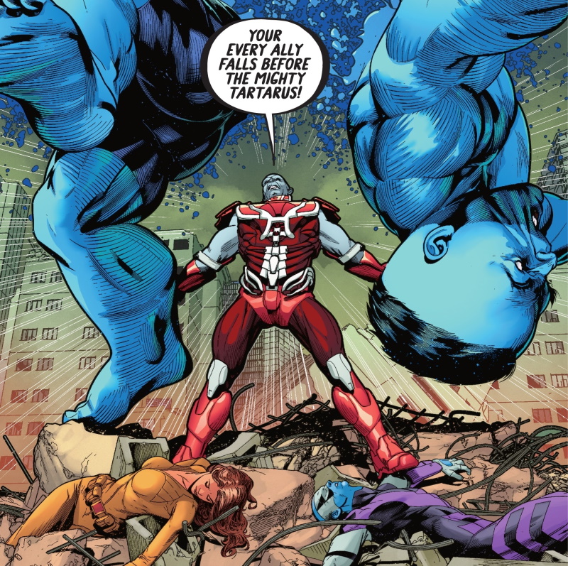 Page 16 – Panel 1: Tartarus literally tears Big Baby in half; at his feet lay Red Dragon on the left and Deadeye on the right.