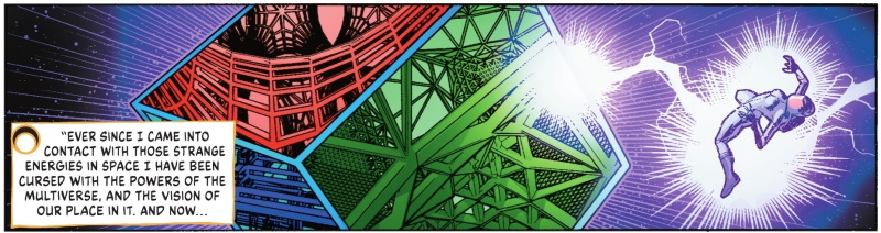 Page 21 – Panel 6: Dr Multiverse’s multivision kicks in and she sees . . .