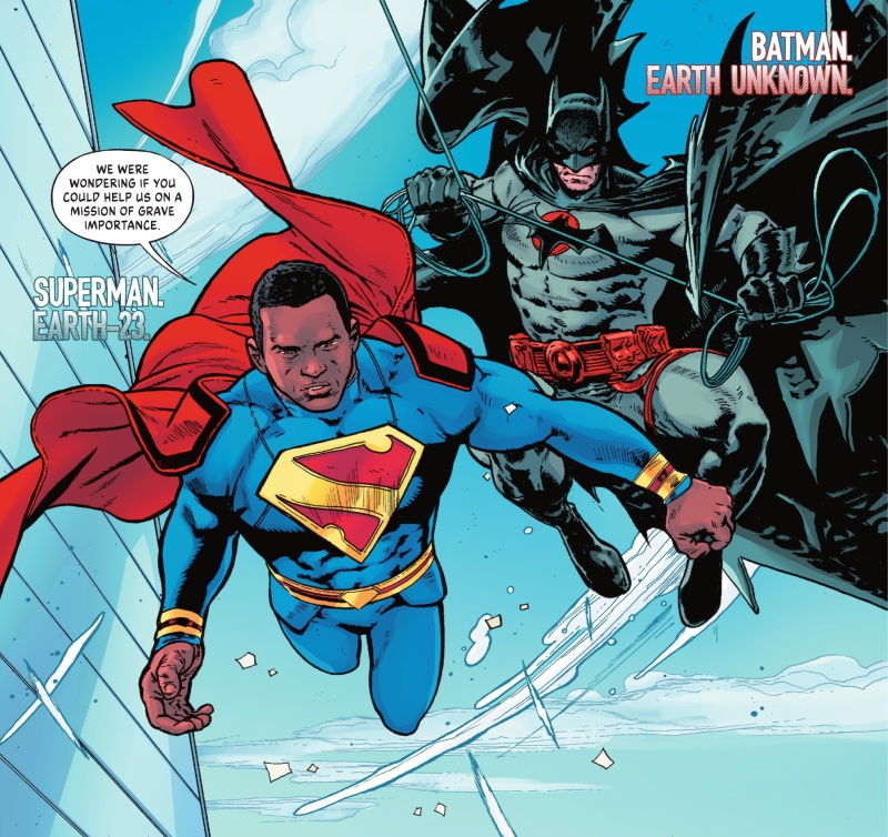 Page 7 – Panel 1: Watching from above are Flashpoint Batman, and Superman of Earth-23. For the rest of this issue, I’ll just refer to them as Batman and Superman.