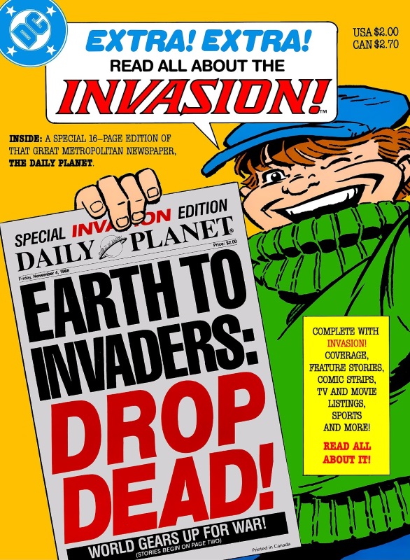 The final page of INVASION! #1 was the cover of a Daily Planet special edition – the one shown being held on the left. It’s a mixture of text pieces that deal with the effects of INVASION! as well as some lighter pieces.