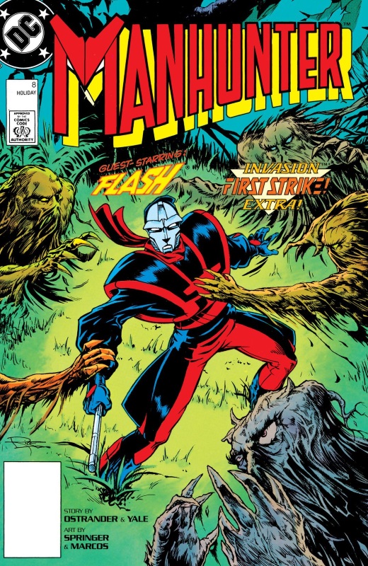 He is attacked and captured by Durlans but manages to escape and, again, track down the Flash and his fellows. Being able to spot the shape-shifting aliens, Manhunter saves Flash from an assassination attempt but is once more captured by the aliens.