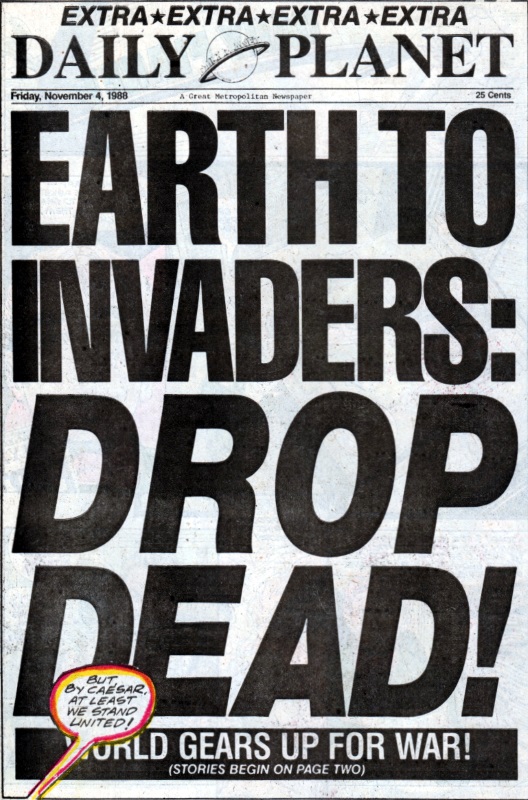 Page 50 – Panel 3: As the invasion begins, this is the first hint that Earth will be given an opportunity to surrender its heroes.