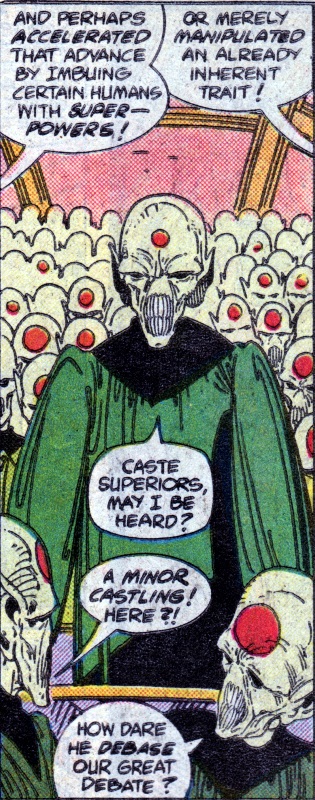 Page 45 – Panel 2: This is the minor Dominator whom I’m referring to as Derek; we last saw him way back on Page 8 when he wanted to tell the other Dominators about his research.