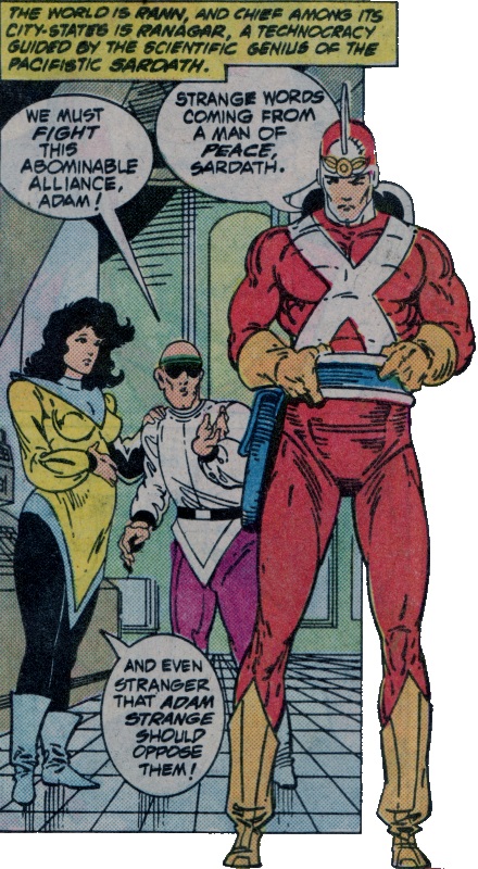 Page 15 – Panel 2: Left to right are Alanna; Sardath; and Adam Strange. Sardath is Alanna’s father, Alanna is married to Adam Strange and currently expecting their first child. Sardath seems determined to fight against the Dominion-led alliance.