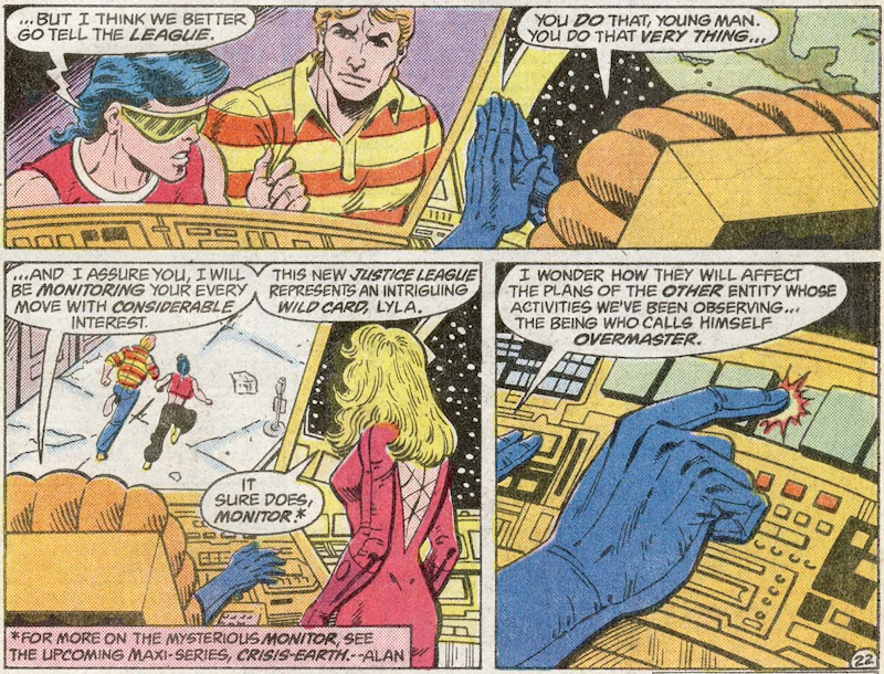 The Monitor and Harbinger, watching everything as they were throughout the run up to the “maxi series, Crisis-Earth” (as it’s called in the caption box) including Crowbar and his new pals in the Cadre. The Monitor mentions the Overmaster as well, some mysterious bad guy who’s put the Cadre together.