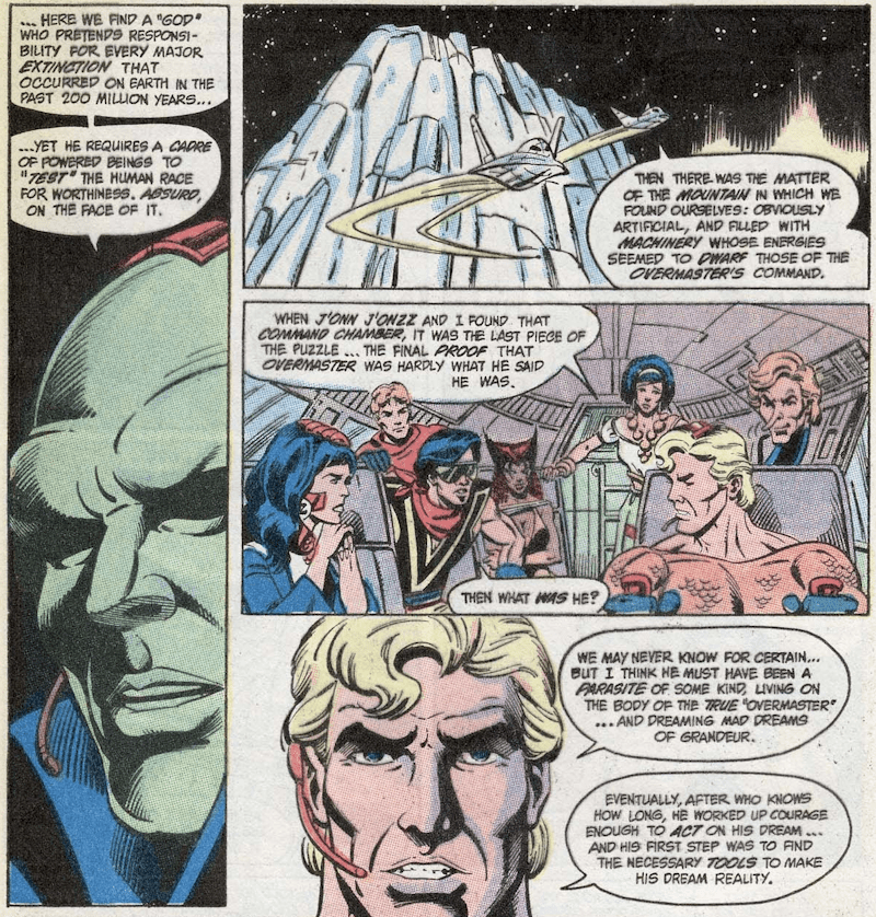 In #236 the Overmaster claims to have been behind all of the mass extinctions in Earth’s history and has brought the League to him to fight the Cadre in order to test humanity’s right to live, which is as preposterous a motive as any.