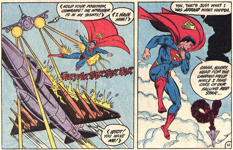 One quick reassemble later and Wonder Woman’s able to deduce that it’s of Soviet Russian design. Leaping to conclusions, the three heroes head to the USSR in order to find out whether the Russians had anything to do with the destruction of their own satellite. While the heroes try to be nice, the Russians attack first and ask questions later.