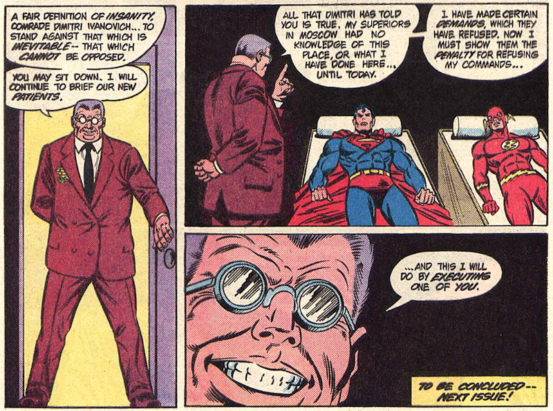 And within moments, two of the strongest superheroes on Earth (and Flash) are captured by the Russians. Remember – just a few pages before, Superman was fast enough to rebuild a satellite while it was still exploding, but can’t stop this guy playing his keyboard.