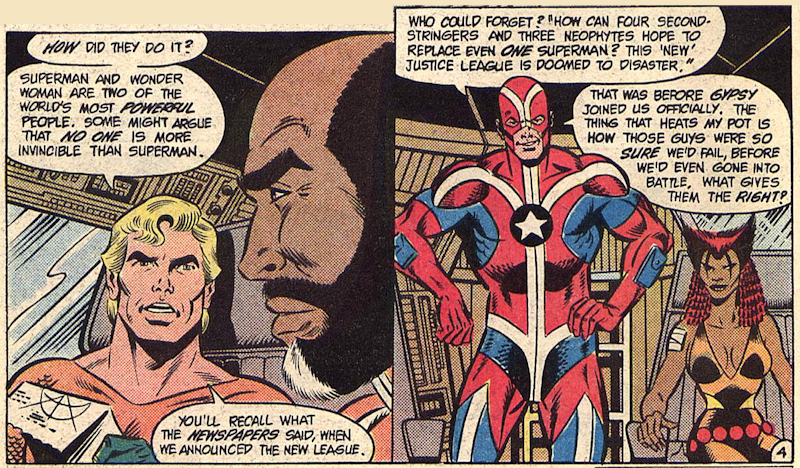 Despite Allegro’s death and the Maestro still being at large (although with a damaged keyboard) the League pile into their plane and head off back to the bunker where, in #239, a long overdue conversation takes place between the new League and the old. Aquaman explains his decisions to disband the League due to a lack of commitment on the part of the more senior members and despite some initial reservations, Superman, Wonder Woman and the Flash have to admit that they agree with him and his decision.