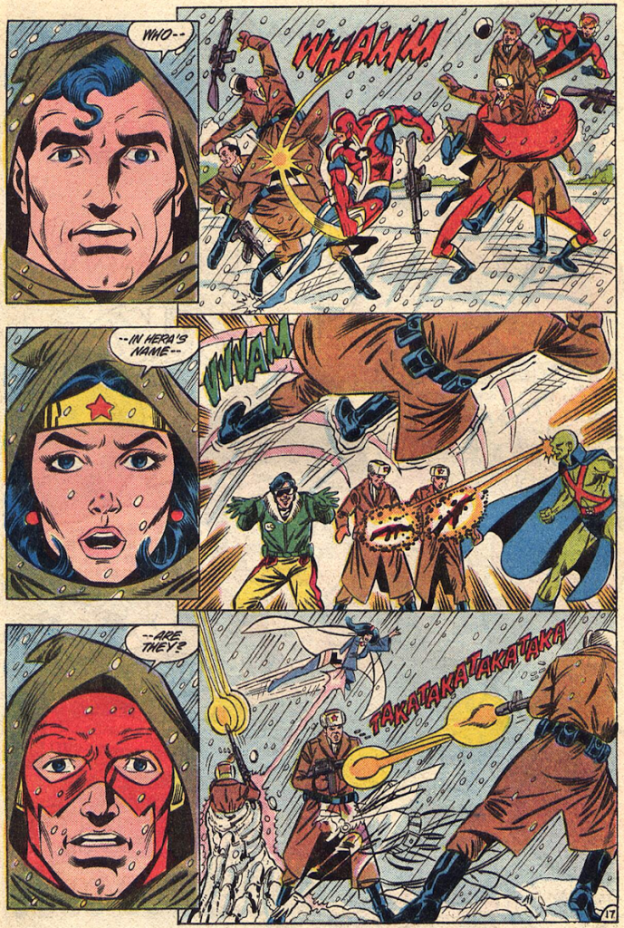 During this time, Superman, Wonder Woman and Flash have been trying to escape, aided by an old enemy of the League, Anton Allegro, who had also ended up as a prisoner of the Russians. It’s revealed that it was his keyboard the Maestro had used to imprison the heroes in the previous issue. Just as the escape attempt is foiled by the Russians, the new League arrive and attack: