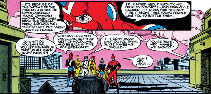Commander Steel isn’t exactly being honest, describing JL Detroit as “a bunch of super-powered young criminals” that he wants the Infinitors to defeat. Note the red sky in the background – the Crisis on Infinite Earths has begun making this one of the last times that Earth-Two would appear.