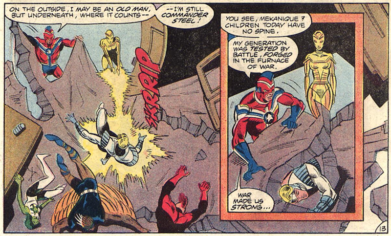 This leaves Infinity Inc wondering about the fight and whether they’ve been duped by Commander Steel and his golden robot. Determined to find out, they enter the bunker.