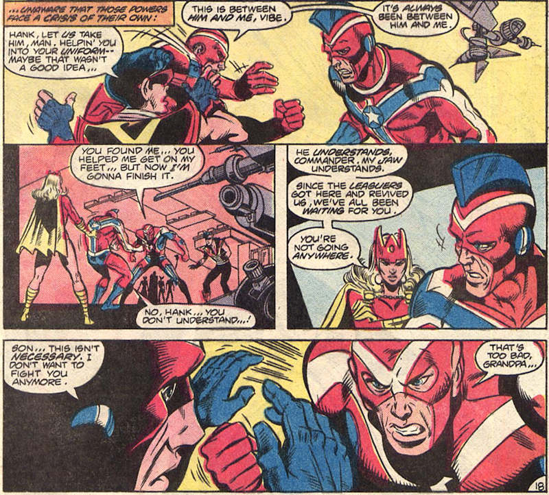 Various other heroes, including Superman, are called in to fight against the satellites and the crazy weather which seems to be channelling towards the dam where the rest of the League have gathered and once again, Green Arrow and Vibe butt heads, this time coming to blows: