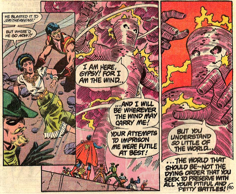 It comes as a surprise only to the Leaguers when the mastermind behind the crazy weather, the satellites and the power station is revealed as the disembodied spirit of the Red Tornado. While he starts off rational, he goes a little messianic, claiming to want to save the world and willing to destroy anyone who stands in his way.