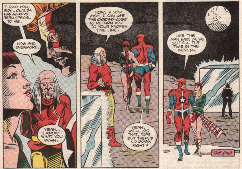 Turns out the six are clones of the Lord of Time (as is Olanda though she was obviously tweaked in the process) who resent him for being the creator and have stolen his Chrono-cube, trapping him at the end of time. Steel agrees to help the Lord attack the six in order to retrieve the cube and in return be sent back to his own time. The attack’s a success and the Lord convinces (off-panel) his younger self not to clone the six, but he does keep Olanda who, it seems, has taken something of a shine to Steel.