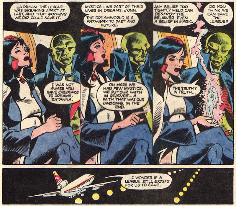 While this iteration of the League will forever be known as Justice League Detroit, it’s perhaps odd to note that with #246 the League are actually kicked out of the bunker headquarters by a repentant Commander Steel who claims to be doing this for their own good. By evicting them, he’s forcing the team, and particularly Steel, to stand on their own two feet. The team say goodbye to their neighbours and Dale Gunn, and jump on a plane to New York and, in a conversation between J’onn J’onzz and Zatanna, there’s more than a hint of despair: