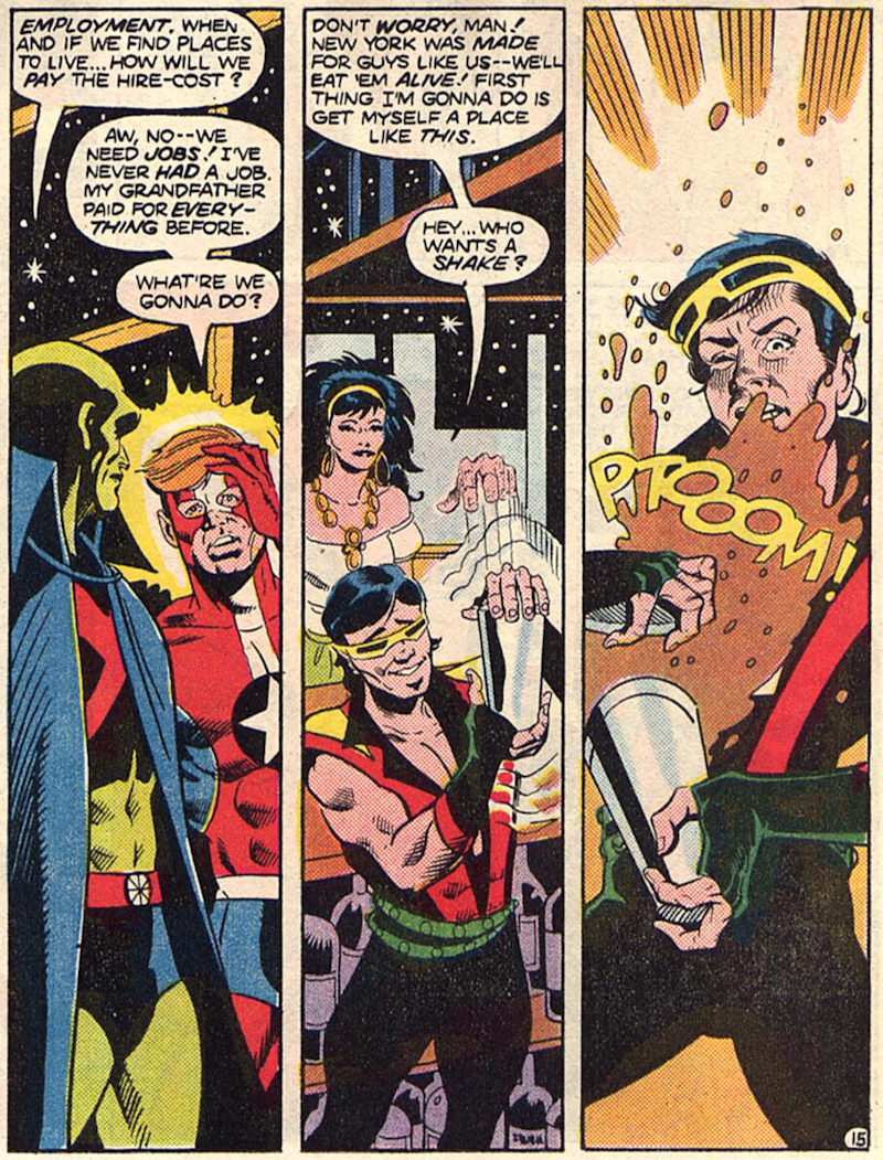 Gypsy invites herself to stay with Vixen in the penthouse, “be like sisters” and “go to parties” with her. Elongated Man and Sue will be house-sitting for some cousins in the suburbs – Westchester to be exact which Ralph describes as boring; I wonder if that’s a sneaky jibe at the X-Mansion? Zatanna has a place in the Village which she sublet to a friend, Sheri, and hopes she won’t mind her returning three months earlier than expected. That just leaves J’onn, Steel and Vibe to find their own places but, as J’onn points out, even if they find somewhere to live, they will still need to earn money to pay the rent which means one thing: getting a job.
