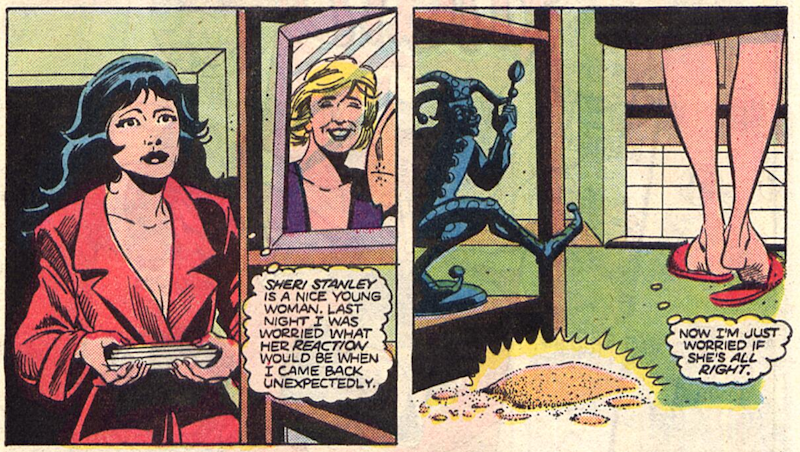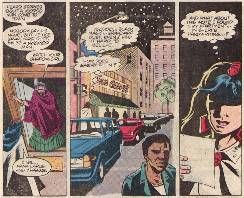 Zatanna, meanwhile, is still hunting for her friend and calls in the services of one Mama LaRue who tells her that the dust found in her apartment is not, as suspected, the remains of Sheri herself but rather graveyard dust. It all adds up to someone new in town who Mama LaRue warns Zatanna against: