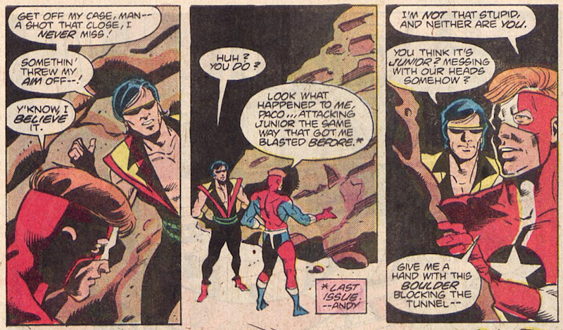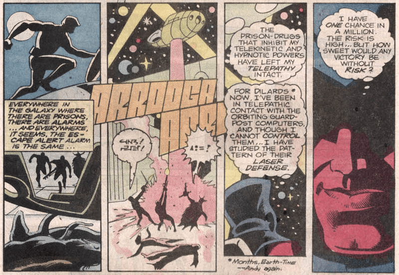There’s another interlude with our mysterious prison escapee who enters the Flame of Py’Tar in order to gain “wisdom and power beyond imagination.” Anyone reading this issue at the time should have been in no doubt as to his identity when seeing the silhouette that enters the flame: that sideways fin could only really belong to one old League enemy, but let’s play along and not name him for a moment.