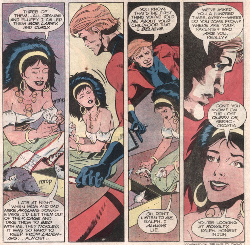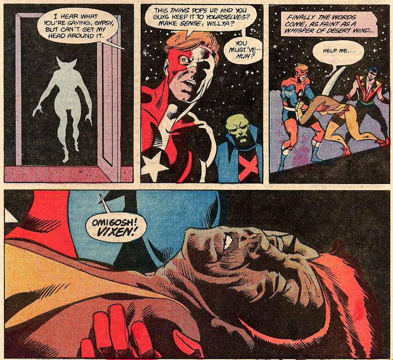 Sue Dibny turns up with a new outfit for Elongated Man, finding Gypsy and Junior on the way, moments before Steel and Vibe catch up to her as well. As they try to get Junior back to the Sanctuary, Gypsy collapses, looking as old and drained as Vixen does.