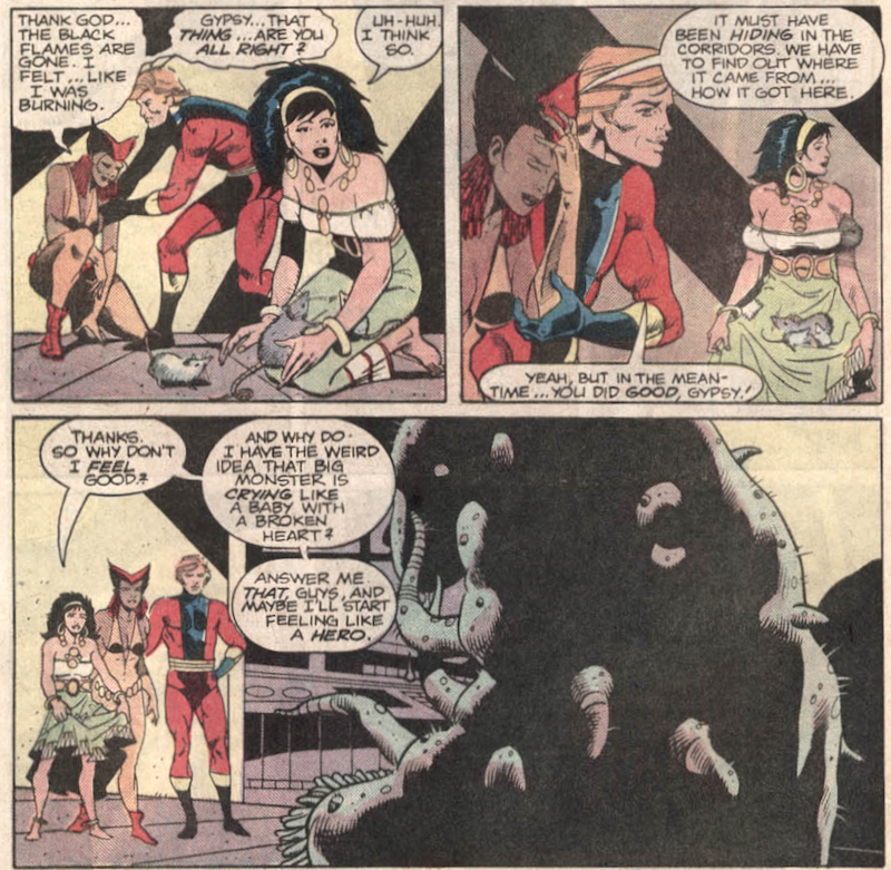 At the Sanctuary, Vixen, Gypsy and Ralph attempt to examine Junior but it bolts, only to run into the returning Steel, J’onzz and Vibe. lashing out at them with the same black flames. Despite Gypsy trying to defend Junior, Steel knocks it out before a very unwell Vixen stumbles out to them: