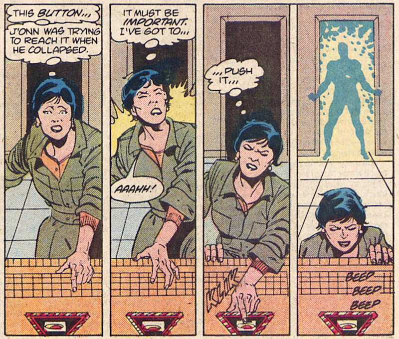 A plan is thought up by Batman to restore the others to health. As Junior’s body contains their life forces, they need a way to transfer them from Junior and back to the heroes. Cue a string of electrified cables across an elevator shaft connected to another cable held by Superman which will “feed the energy back through the Sanctuary’s internal wiring up to the Medi-lab where, with luck, it’ll rejuvenate the dying Justice Leaguers.“